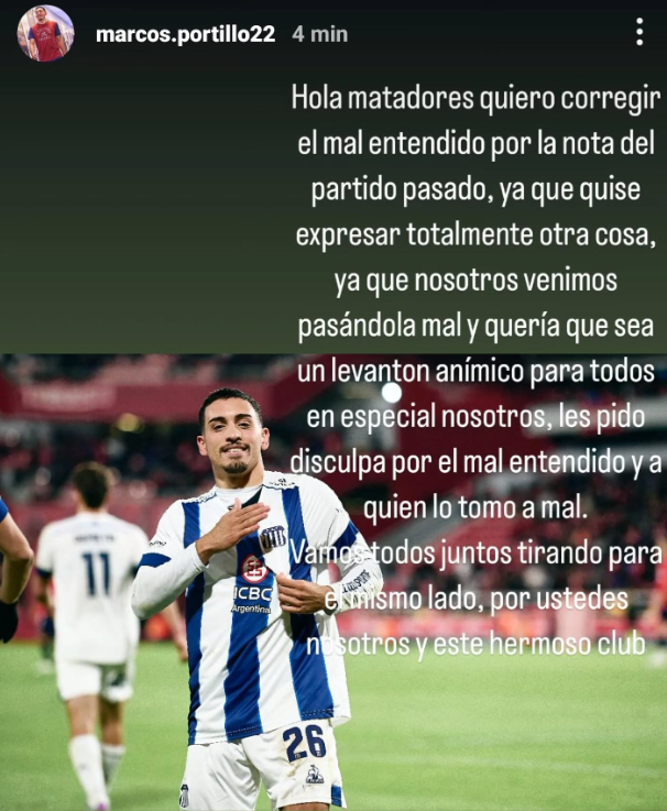 Marcos Portillo se sumó a la lista de Guido Herrera, Matías Galarza y Miguel Navarro, al compartir en sus redes sociales pedidos de disculpas por el momento deportivo que atraviesa Talleres en el campeonato.