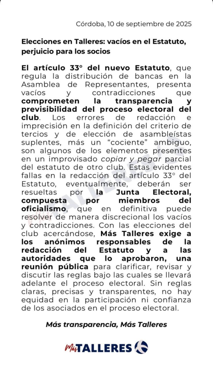 “Estas evidentes fallas en el artículo 33º del Estatuto, deberán ser resueltas por la Junta Electoral, compuesta por miembros del oficialismo”, advirtieron desde Más Talleres, reclamando que los responsables de la redacción y aprobación del Estatuto den explicaciones en una reunión pública con los socios.