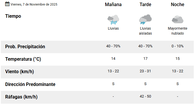 Según el pronóstico, se esperan precipitaciones intensas, vientos con ráfagas superiores a 90 km/h y posible caída de granizo. El fenómeno está asociado al ingreso de una masa de aire húmedo y cálido que favorece la formación de tormentas en el territorio provincial, especialmente en el sur y sudoeste de Córdoba.