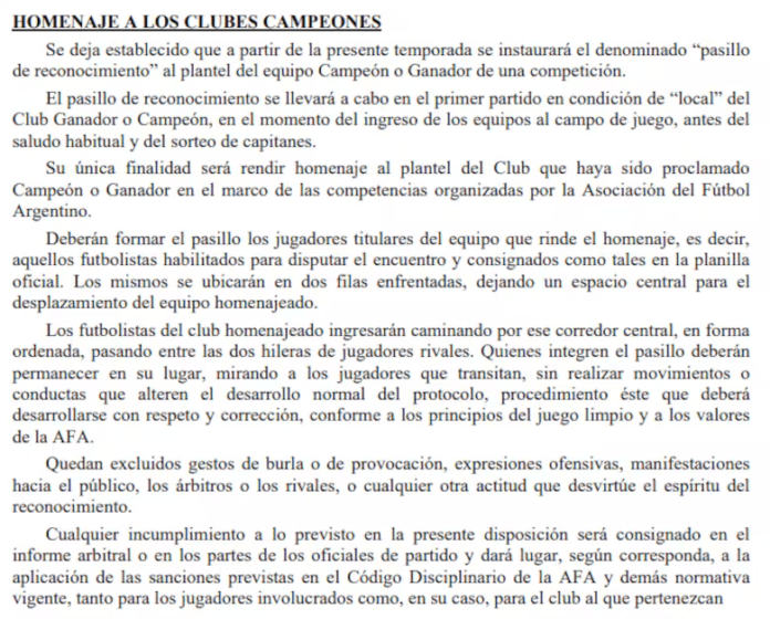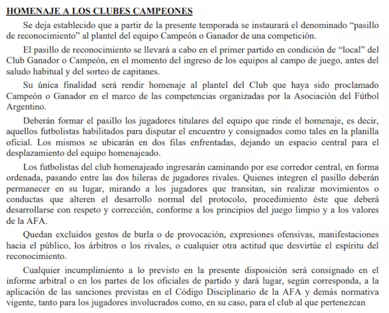 El Boletín 6625 establece que el homenaje debe realizarse en el primer partido de local del conjunto que se consagre en una competencia organizada por la Asociación. Pero en esta temporada hubo dos casos concretos en los que el protocolo no se cumplió.