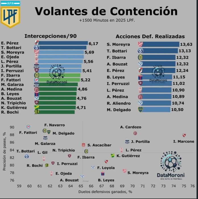 El colombiano figura en las estadísticas como un “volante que recupera y juega”. Tiene números parejos tanto en acciones defensiva como en porcentajes de pases, ambos por encima de la media.