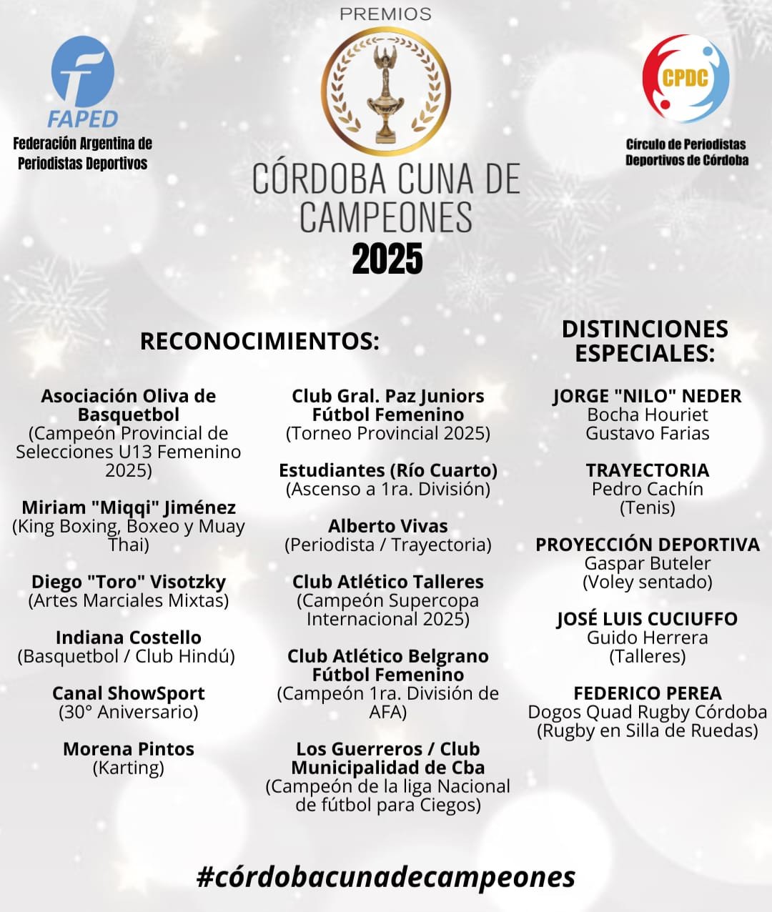 Este jueves se realizará la edición 46 de los premios Córdoba Cuna de Campeones, tradicional gala del Círculo de Periodistas Deportivos de Córdoba.