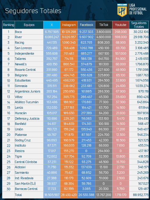 El ranking está conformado por Boca (30.232.106), River (29.918.706) y Racing (3.232.340). En cuanto a los cordobeses, Talleres es el primero en aparecer, en la sexta posición (2.419.653); en el noveno puesto está Belgrano (1.687.763), mientras que Instituto se destaca en el 22° lugar (455.314).