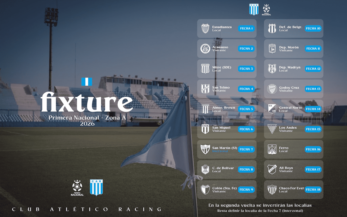 La Primera Nacional 2026 inicia en el mes de febrero, y Racing de Nueva Italia se está preparando para su debut. Si bien la Asociación del Fútbol Argentino no oficializó el cronograma, se difundió el calendario tentativo para las dos primeras jornadas del campeonato.