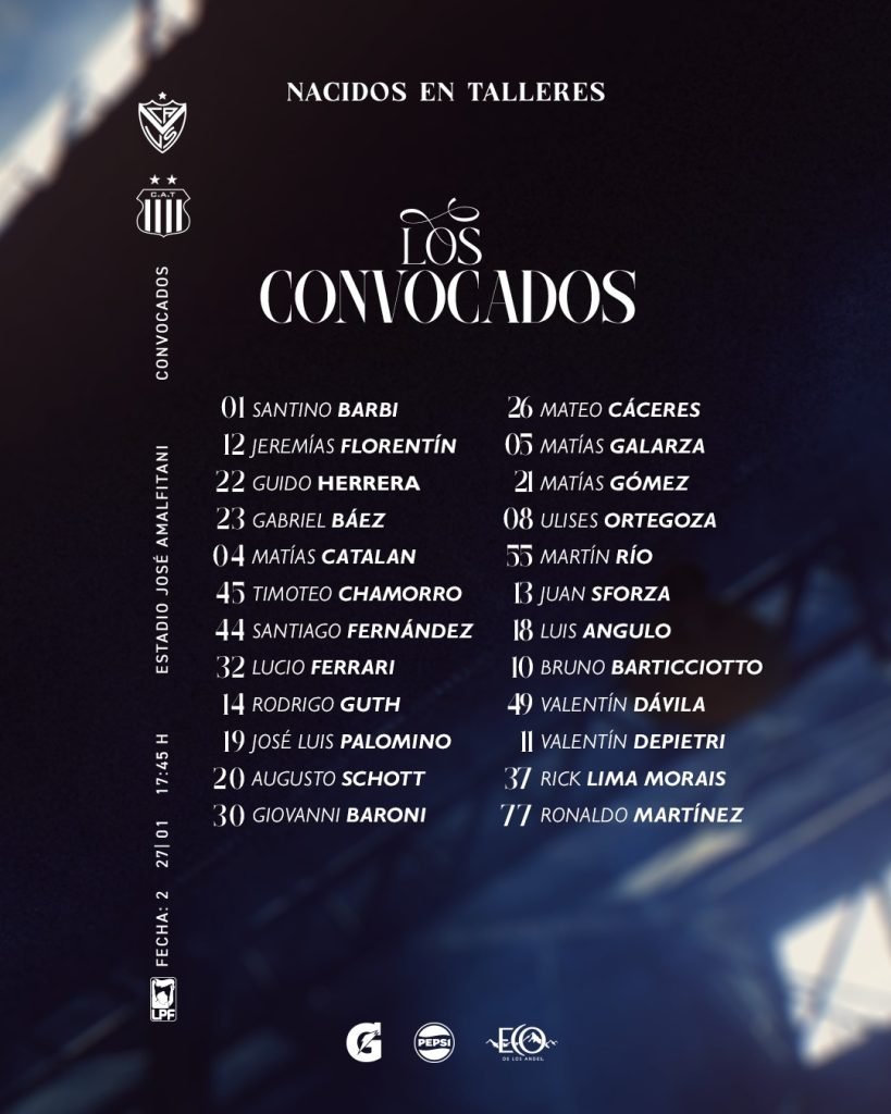 Con respecto a la última convocatoria se suman los nombres de Santino Barbi, Mateo Cáceres y Martín Río, flamante refuerzo albiazul. En contrapartida no integran la nómina Lautaro Ortiz ni Emiliano Chiavassa.
