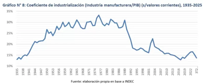 Del estudio se desprende que el peso de la industria en la economía bajó del 16,5% en 2023 a 13,7% en 2025. Estas cifras, dice el informe de la UBA, se remontan a antes de la Segunda Guerra Mundial (casi 90 años).
