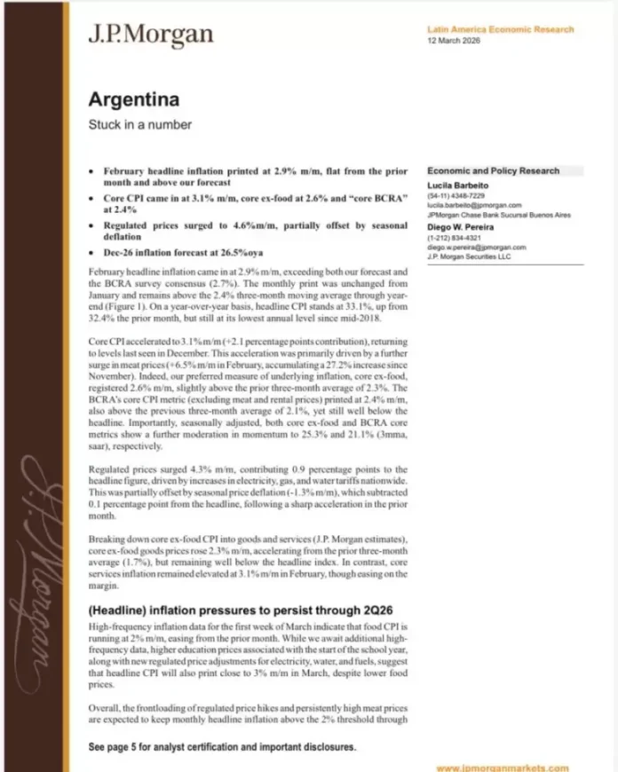 En consecuencia, JP Morgan proyecta que la inflación general promediará un 2,5% mensual en el primer semestre de 2026, desacelerándose hasta el 1,5% en el segundo semestre de 2026, “en consonancia con la inflación general a diciembre de 2026, que se situará en el 26,5% anual”.