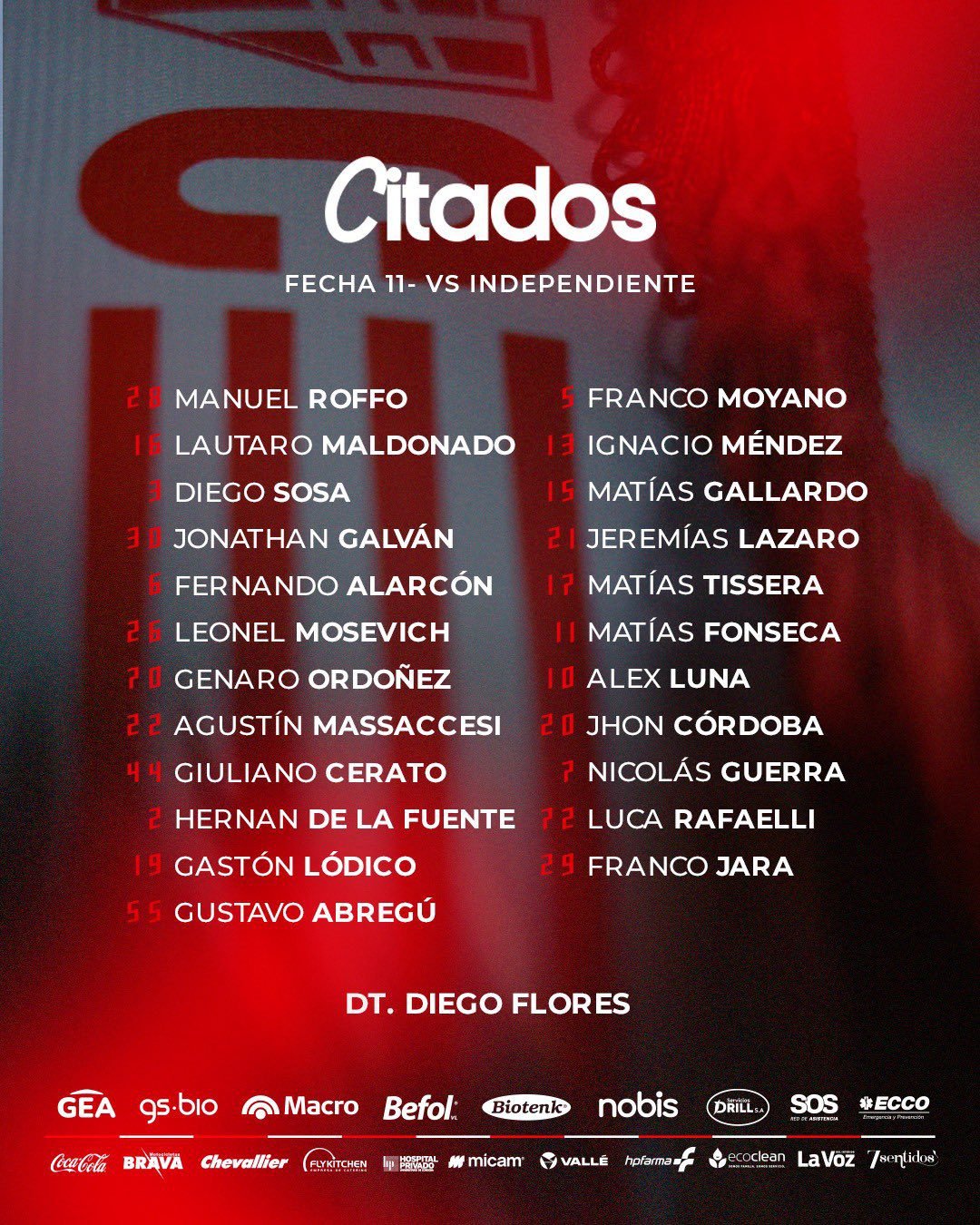 Repasando la lista de convocados, Diego Flores sufrirá la baja de varios futbolistas. Ellos son Iván Erquiaga, quien presenta una sobrecarga muscular en el recto femoral del muslo izquierdo, Emanuel Sittaro, debido a un dolor en la región pubiana asociado a una sobrecarga tendinosa de los músculos aductores, Jonás Acevedo, que sufrió un edema miofibrilar en el recto femoral del muslo derecho y Agustín Bravo, quien está con una lesión en la unión miotendinosa del recto femoral derecho.