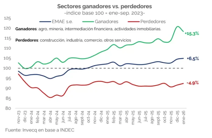 Desde Invecq lo dicen sin tapujos: en la economía de Milei hay sectores “ganadores” y otros, “perdedores”. Los primeros -con datos hasta enero- se mantienen 15,3% respecto al nivel de noviembre de 2023 mientras que los perdedores continúan 4,9% por debajo del nivel del inicio del gobierno, y se encuentran estancados desde junio de 2025.