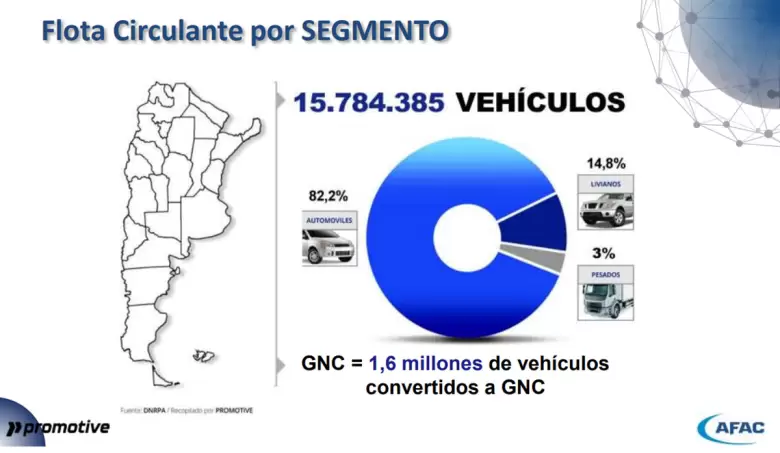 La flota vehicular al cierre de 2025 estaba conformada por 82% de automóviles, 15% de comerciales livianos y 3% de comerciales pesados, incluyendo camiones y ómnibus (sin considerar acoplados, remolques, motocicletas, cuatriciclos, maquinaria vial o agrícola).
