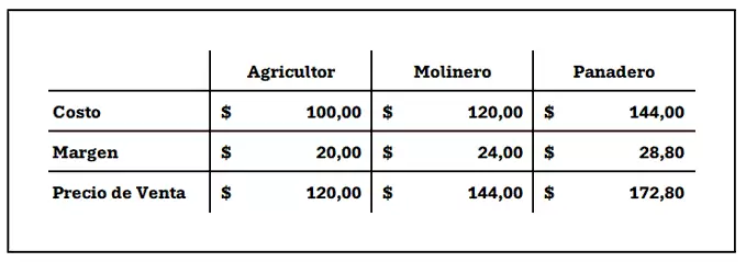 Supongamos que un agricultor produce trigo con un costo de $100,00 y le añade un margen del 20% vendiéndolo a $120,00. El molinero a su vez aplica su propio margen del 20% a la harina, vendiéndola a $144,00. El panadero paga ese precio por la materia prima, aplica un margen del 20% y vende el pan al consumidor final a $172,80.