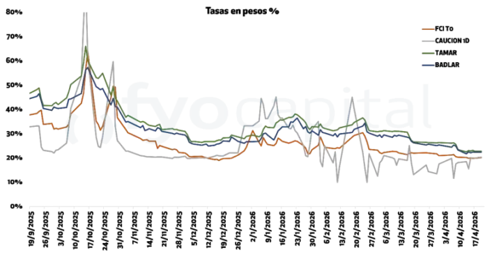 Comenzando el 2026, el BCRA comenzó su nuevo esquema de compras de dólares, con emisión de pesos que luego el Tesoro esterilizaba vía licitaciones. Semana a semana se retiraron del sistema más pesos de los que se emitían, contrayendo la base monetaria a un ritmo lento. La contracción monetaria sumada a los aumentos de encajes, provocaron que las entidades tengan que competir por una escasa liquidez. El resultado fue volatilidad en las tasas, con la caución tocando máximos intradiarios de hasta 90%, presionando el resto de las tasas al alza.
