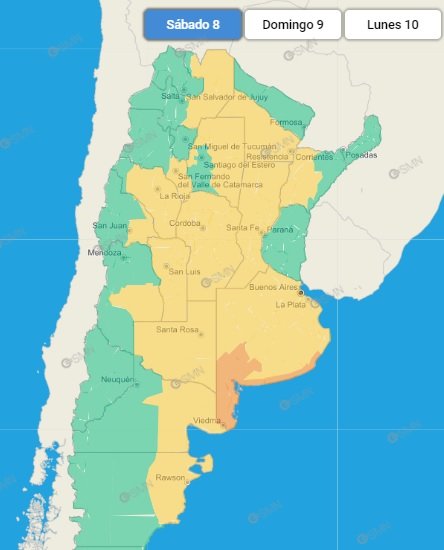 Particularmente, las provincias que tienen este pronóstico durante la mañana y tarde de la jornada son Córdoba, Salta, Chaco, Corrientes, Santiago del Estero, Catamarca, La Rioja, Santa Fe, San Luis, San Juan, Mendoza, Buenos Aires, La Pampa, Río Negro y Chubut. En tanto, la alerta es naranja en la zona sur de la Provincia de Buenos Aires y oeste de La Pampa.